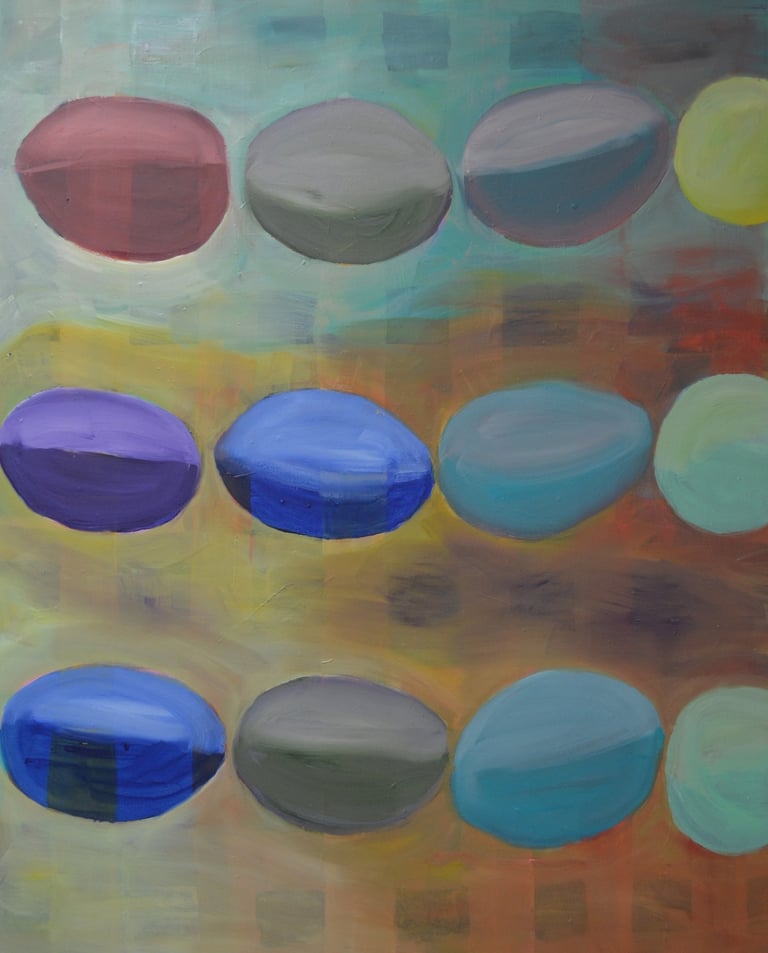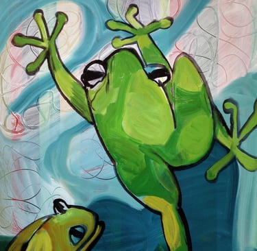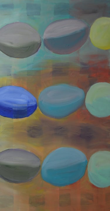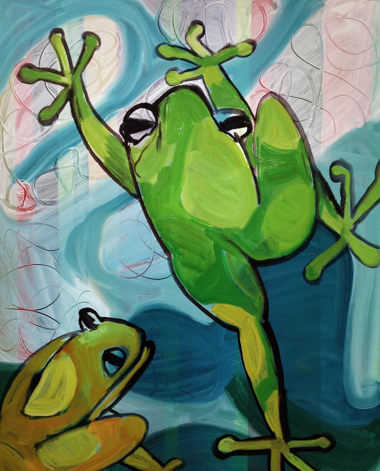 After years of traveling, I returned to the Bay Area to find my way as an artist. I discovered working freely on large pieces especially exciting, probably as an antidote to the careful, slow way I walked using one or two canes. I use oil paint and generally develop a scenario with some recognizable forms, like animals or people. My paintings are often humorous, which is a saving grace in a difficult or perplexing world.